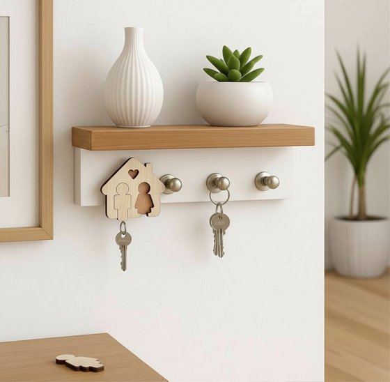Eco-friendly natural wood keychain holder with a charming couple-in-home design.